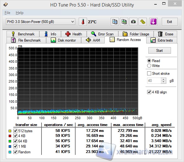 Le prestazioni dell’Armor A60 sono ottime, infatti la velocità in lettura e scrittura è la più alta tra quelle dei vari HD testati ultimamente. Rispetto al modello Armor A15, sempre di Silicon Power, il modello A60 offre prestazioni migliori in tutti i vari test che offre questo benchmark professionale. Nella media degli HD 2,5” gli access time.
