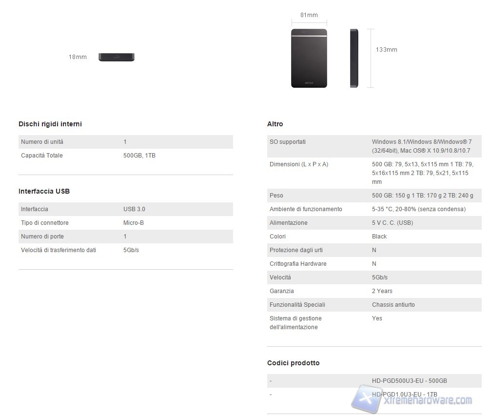 Riportiamo di seguito la tabella riportante le specifiche tecniche del Buffalo MiniStation DDR HD-PGDU3. Vi ricordiamo che tali informazioni sono disponibili presso il sito del produttore, al seguente indirizzo: http://www.xtremehardware.com/storage/docking-e-storage-esterno/buffalo-drivestation-ddr-2tb-l-ssd-mancato-201309279069/?start=1