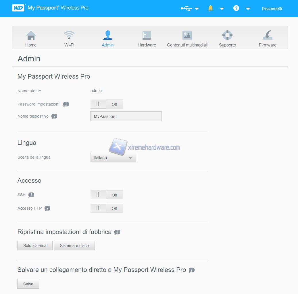 Nella seconda schermata possiamo gestire la connessione wireless del dispositivo. Infatti possiamo scegliere se utilizzare il device solo tramite Wi-Fi Direct o collegarlo alla nostra rete Wi-Fi, così da utilizzarlo come Hard Disk di rete.