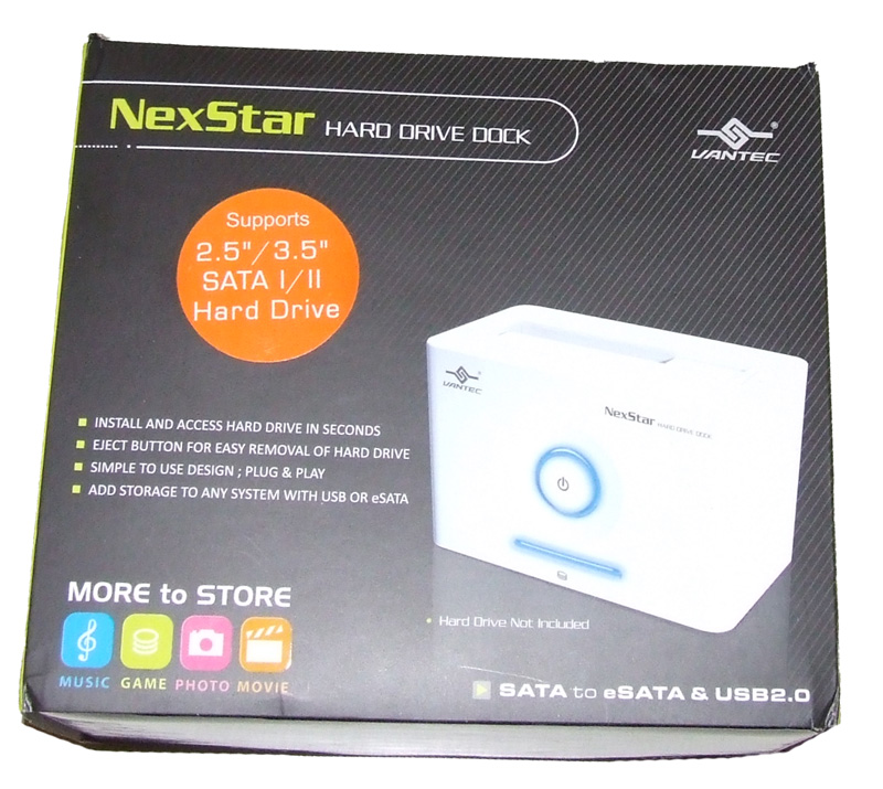 Vi siete mai trovati nella situazione di dover salvare dei dati da un hard-disk di un computer desktop rotto? O forse, peggio, vi siete mai trovati a dover fare dei backup di hard disk di notebook? In caso la risposta fosse affermativa ad una o entrambe delle due domande questo prodotto fa al caso vostro. Vantec ha realizzato infatti un HardDrive Dock SATA to e-SATA e USB.La confezione si rivela molto accattivante, colorata e ricca di scritte. Una volta aperta la confezione ci troviamo davanti al dock stesso. Il prodotto in se per se è molto "plasticoso" e al tatto sembra fragile, ma è solo una prima impressione visto che lo stiamo utilizzando da giorni senza risparmiare alcun maltrattamento e non ha mai dato un segno di cedimento.