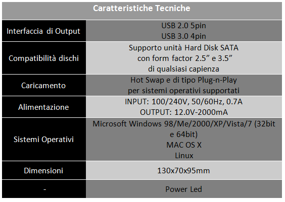 Il prodotto iTEK ha una dimensione di 130x70x95mm, ed un peso ridotto, il tipo di interfaccia di collegamento di output è di tipo USB 3.0 e di tipo USB 2.0. Il supporto è garantito per dischi di qualsiasi capienza e con un form factor standard di 3.5" ma anche nel formato più ridotto di 2.5". Il tipo di collegamento ad un personal computer non richiede l'ausilio di driver, il riconoscimento è di tipo Plug-n-Play e HotSwap. L'unità necessita di alimentazione esterna fornita dall'apposito adattatore di rete elettrica A/C che fornisce un tensione di tipo DC di 12.0V, e che permette di alimentare correttamente i dischi installati. I sistemi operativi supportati sono diversi, vanno dal Windows 98 fino ad arrivare a Windows 7, supporto anche per sistemi Mac OS X e Linux e sistemi operativi a 32bit e 64bit.