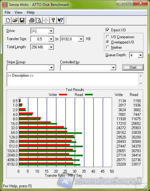 ATTO è un benchmark gratuito che esegue dei semplici test in lettura ed in scrittura in modalità sequenziale adoperando una Queue Depth (file in coda) di 4.