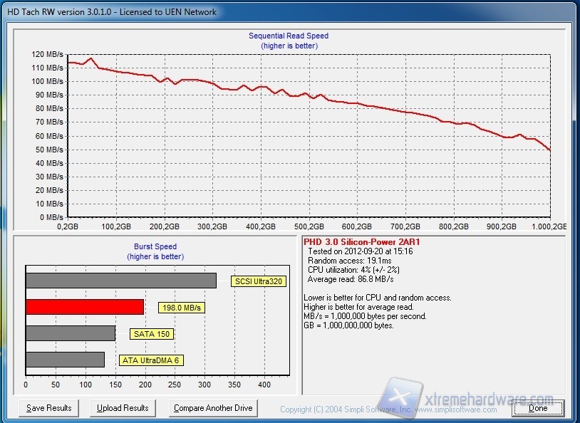 Questo software, anche se un po’ datato, ci permette di verificare l'andamento prestazionale sull'intera superficie del disco. I risultati ottenuti sono in linea con quanto ottenuto dai benchmark precedenti.