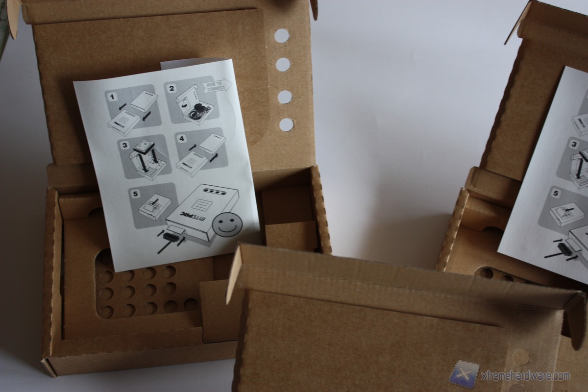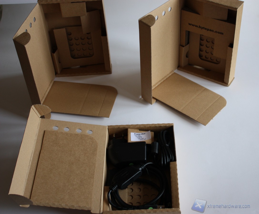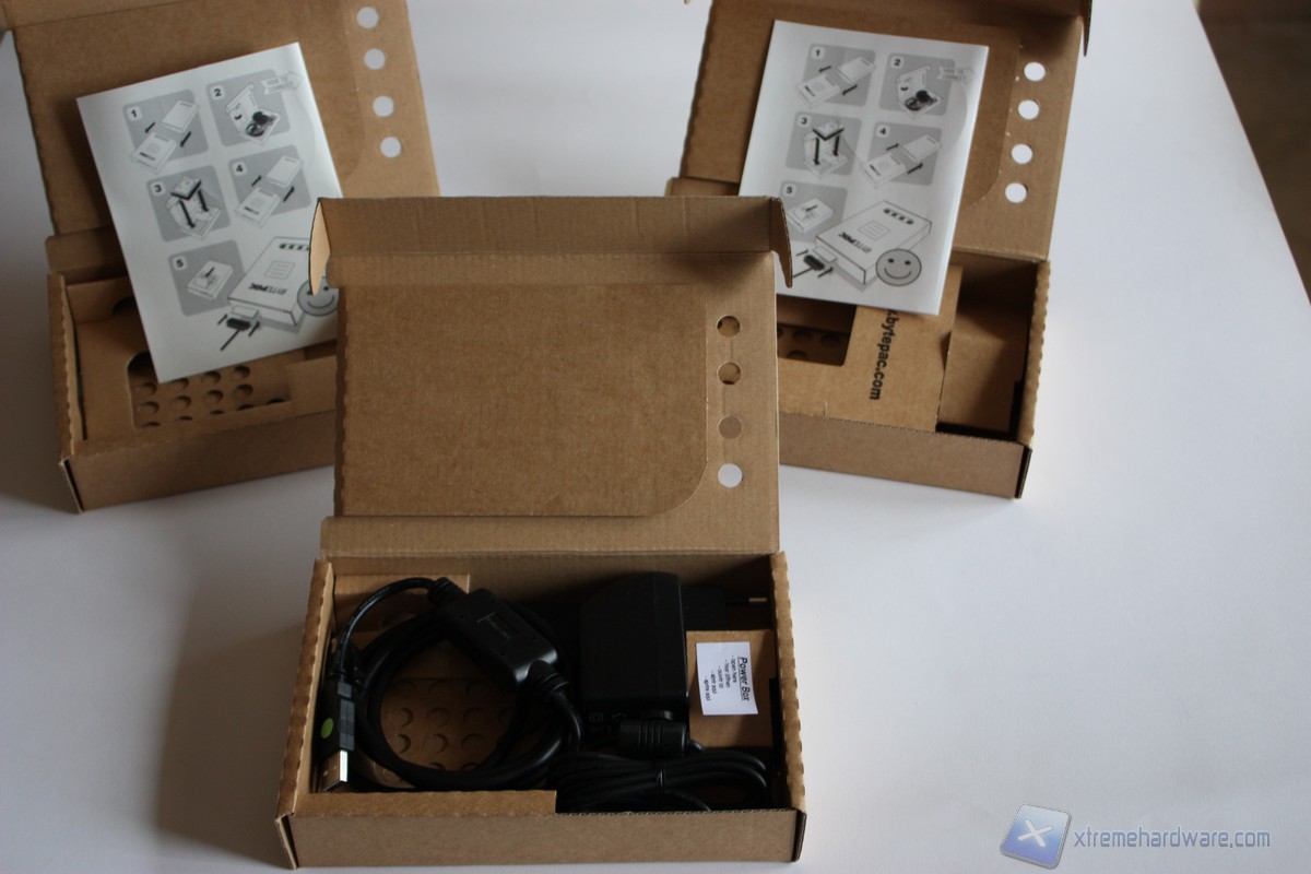 Passiamo adesso alla fase di apertura dei Bytepac: notiamo come due di questi contengano solo il manuale di installazione e adesivi, mentre un terzo contiene gli adattatori, i cavi e l'alimentatore necessari alla connessione al computer.