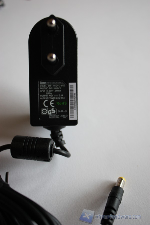 Infine analizziamo l'alimentatore, questo è essenziale per alimentare tutto il collegamento dei Bytepac al computer. L'alimentatore è realizzato in materiale plastico molto solido con un cavo di collegamento di circa 50 cm. E' dotato anche di un nodo in ferrite rivestito di materiale plastico per prevenire da interferenze elettromagnetiche e stabilizzare la corrente passante. L'alimentatore è prodotto dall'azienda ceca Sunny con sede a Brno. Sono riportati su di esso il model e part number, i voltaggi ed amperaggi nonchè le tensioni di entrata e uscita. Non mancano un codice a barre su un adesivo e i loghi ROHS;CE,TUV e GS, enti preposti a testare l'affidabilità e il processo ecologico.
