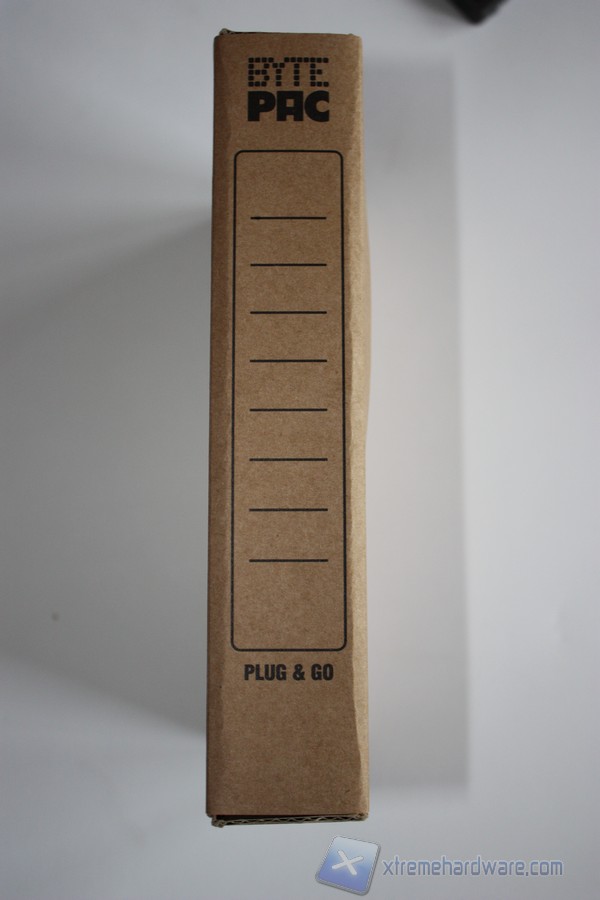 Una volta estratti dalla scatola in cartone, ci troviamo dinanzi ai Bytepac. La prima cosa che si può notare, sono tutti i loghi che ne confermano interamente il processo ecologico di realizzazione. Frontalmente troviamo la scritta Bytepac e poco più sotto delle righe su cui annotare il contenuto, o più semplicemente catalogarli numericamente o alfabeticamente. Troviamo questa caratteristiche anche nella parte posteriore degli stessi. Osseriviamo come i Bytepac siano a loro volta infilati in delle sagome di cartone che li mantengono saldi e ben chiusi. Si possono notare anche dei fori per un ricircolo d'aria che gioverà sia alle temperature degli hard disk inseriti al loro interno che alla conservazione nel tempo.