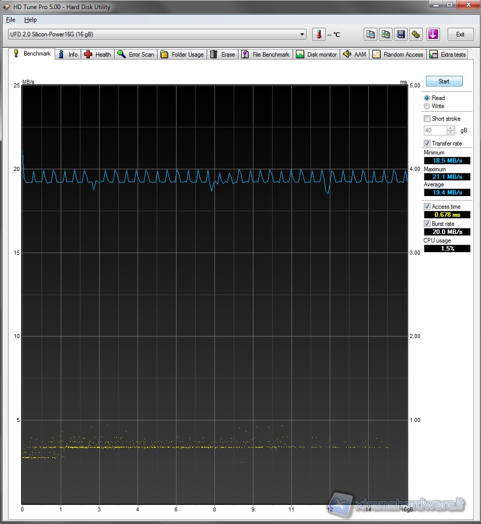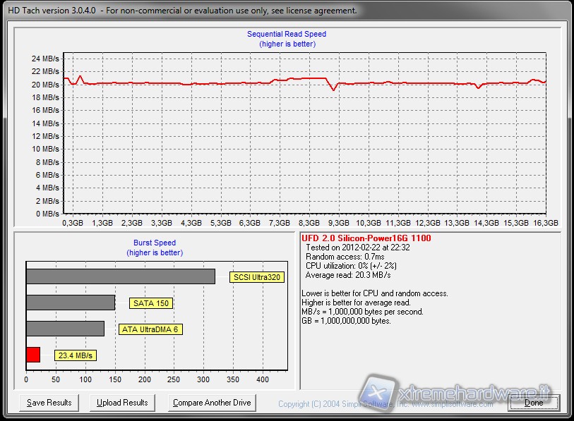 Anche i test eseguiti con questo benchmark confermano i valori precedentemente registrati dagli altri test. Abbiamo una media di lettura attorno ai 20 MB/s con un access time di circa 0,7 ms. Valori sicuramente buoni per un unità Flash Drive USB di seconda generazione.