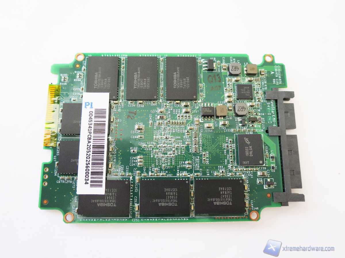Proseguendo nell’analisi troviamo come abbiamo visto, lungo il perimetro, i chip di memoria Toshiba con sigla TH58TEG7DDJBA4C e processo litografico a 19nm. Sull’intero PCB sono ospitati ben sedici package di tipo 40 TSOP che hanno ciascuno una densità di ben 16GB (grazie a due die da 8GB). Nel dettaglio tali chip sono NAND Flash Toggle Mode sincrone con un sistema MLC (Multi Level Cell) a due bit per cella. La loro vita stimata è di circa 3.000 cicli di scrittura. Come sappiamo inoltre un’interfaccia di questo genere permette un maggior scambio di dati con conseguente innalzamento delle prestazioni generali del drive.