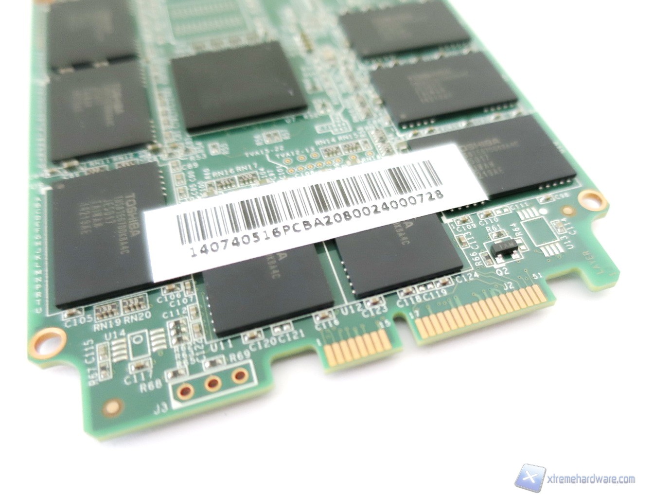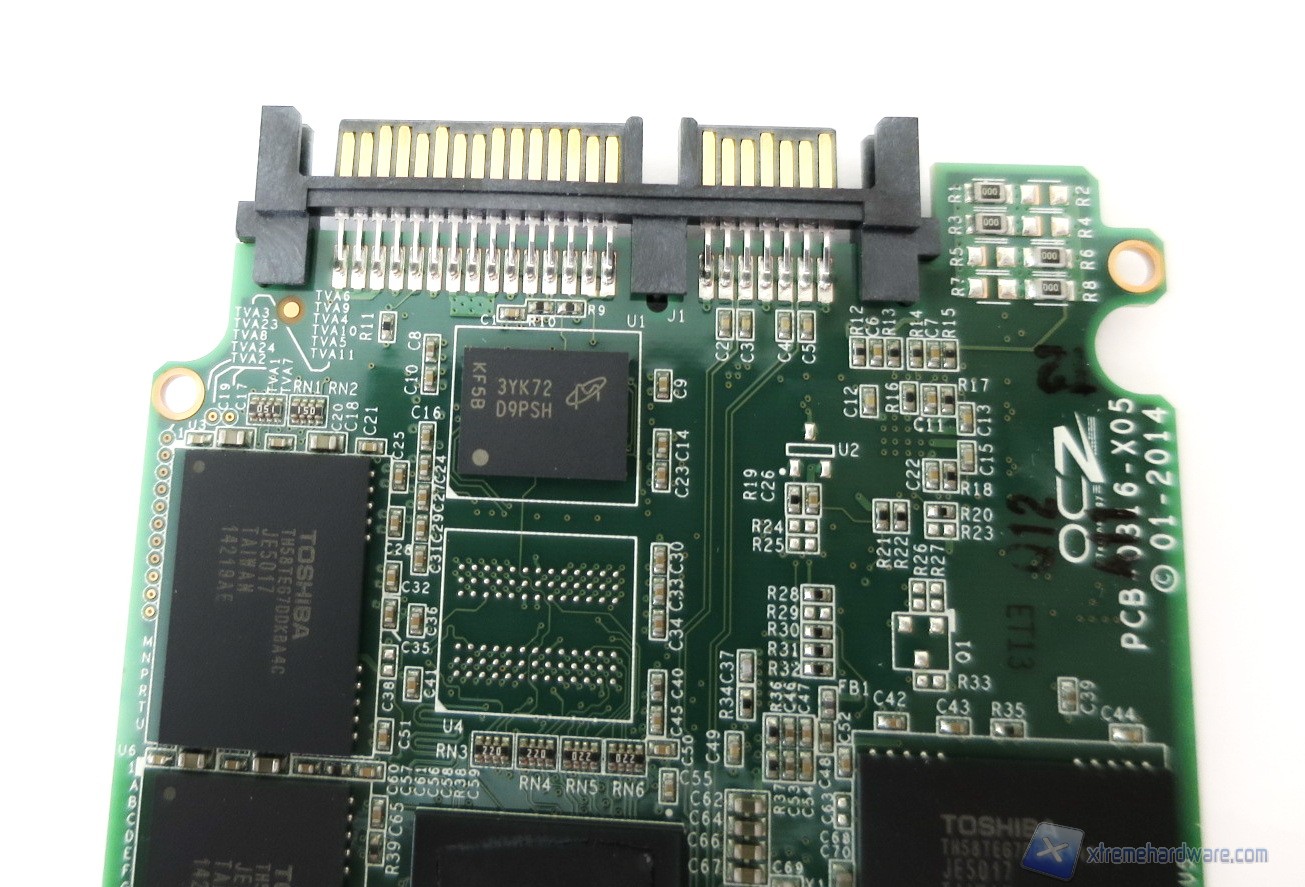 Proseguendo nell’analisi troviamo, lungo il perimetro, i chip di memoria Toshiba con sigla TH58TEG7DDJBA4C e processo litografico a 19nm. Sull’intero PCB sono ospitati ben sedici package di tipo 40 TSOP che hanno ciascuno una densità di ben 16GB (grazie a due die da 8GB). Nel dettaglio tali chip sono NAND Flash Toggle Mode sincrone con un sistema MLC (Multi Level Cell) a due bit per cella. La loro vita stimata è di circa 3.000 cicli di scrittura. Come sappiamo, inoltre, un’interfaccia di questo genere permette un maggior scambio di dati con conseguente innalzamento delle prestazioni generali del drive.