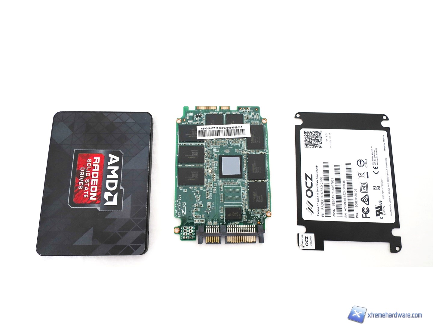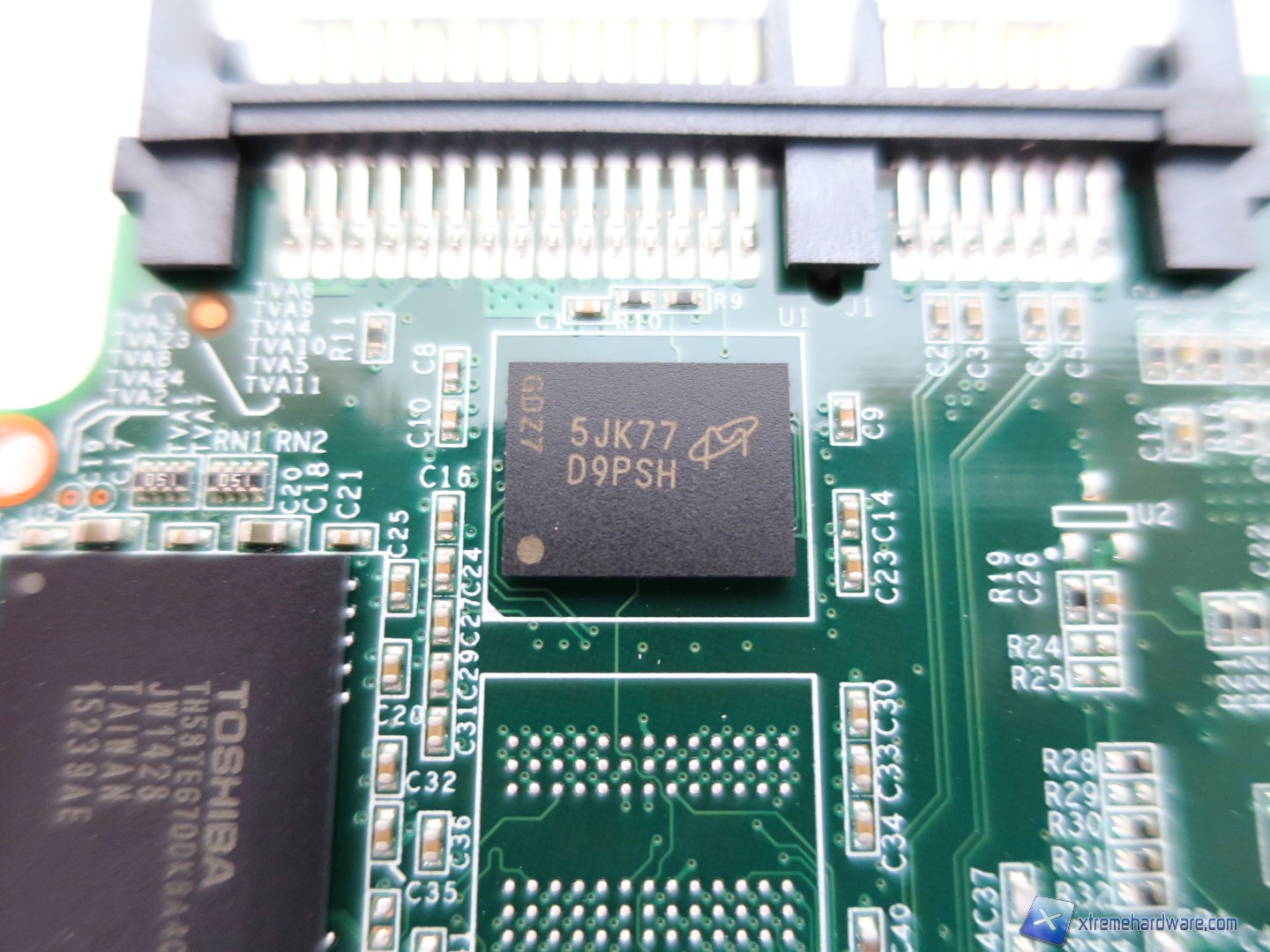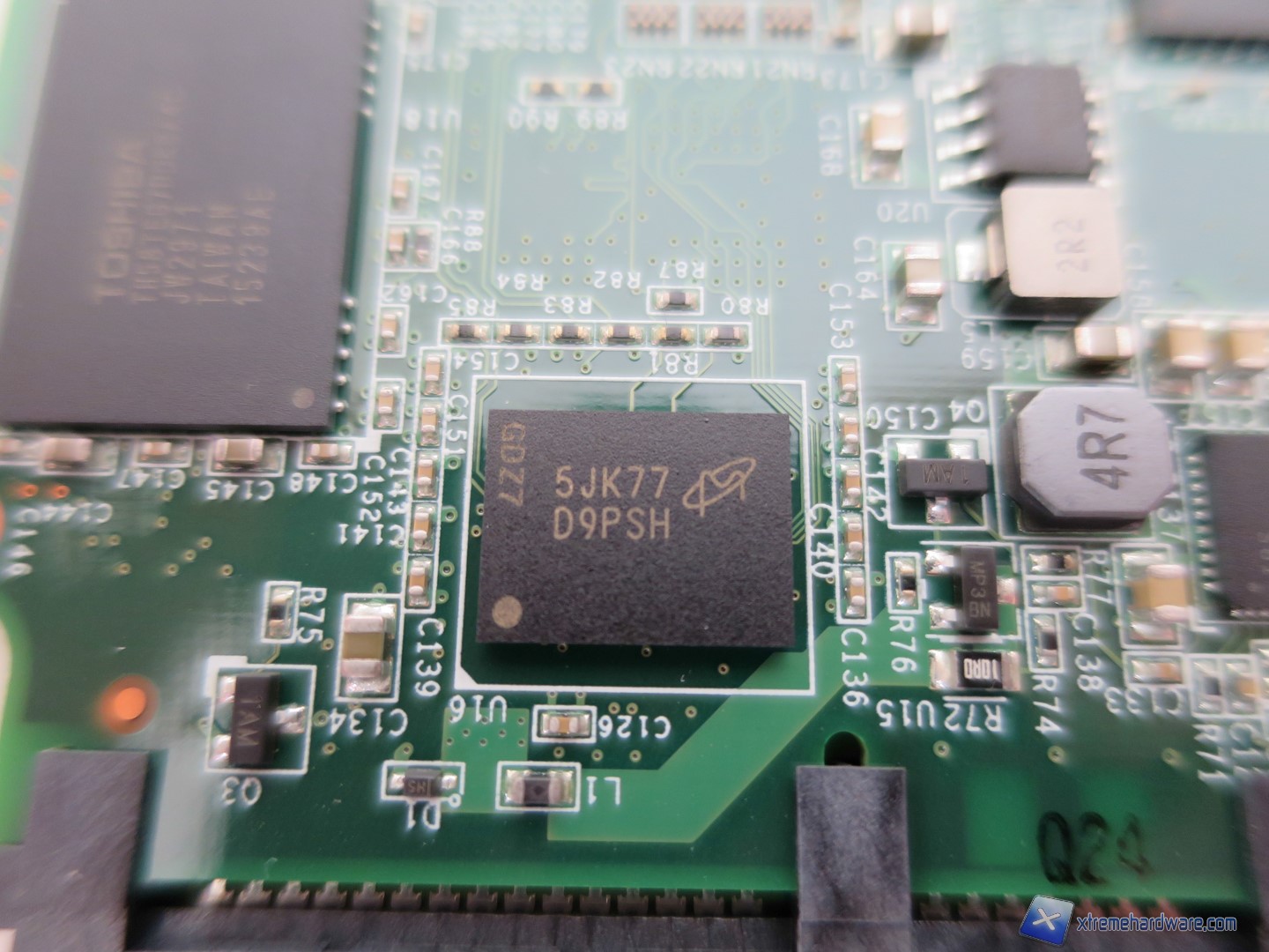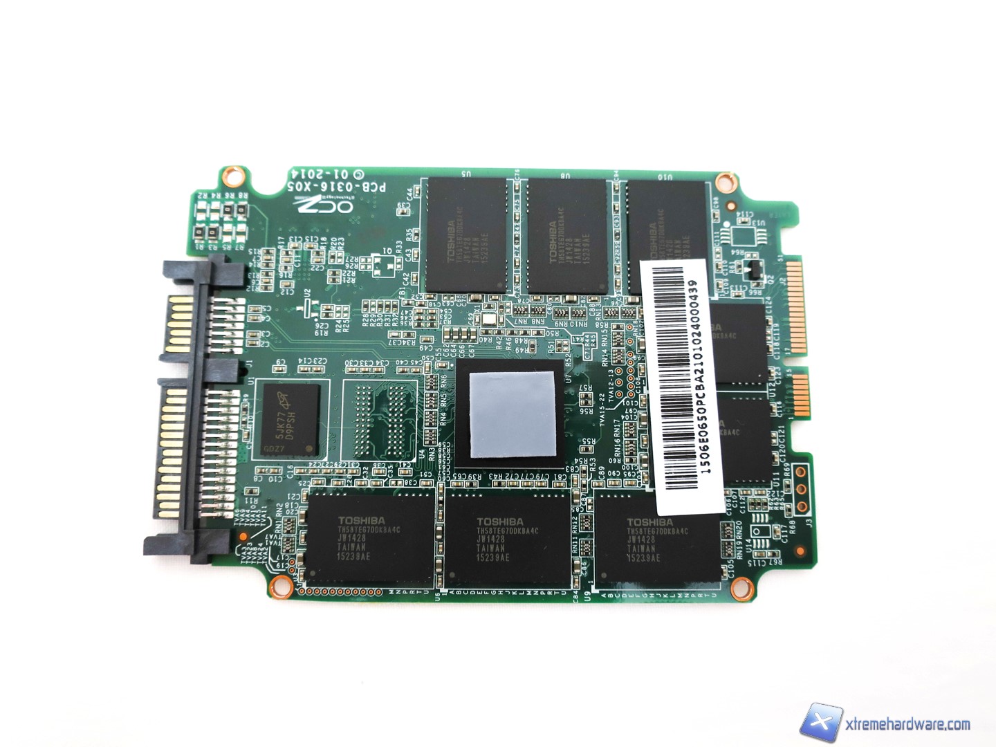Intorno al controller Indilinx Barefoot 3 M00 troviamo i primi 8 chip NAND Toshiba A19 di tipo MLC con sigla TH58TEG7DDKBA4C da 16GB ciascuno. Gli altri 8, posti nel lato inferiore del PCB, per un totale di 16 chip di memoria NAND offrono una capacità complessiva di 253GB che si riducono a 240GB, in quanto la percentuale rimanente di spazio verrà sfruttata dall’over-provisioning. Una volta formattato l’SSD, tale capacità scenderà di poco offrendo uno spazio complessivo per l’utente di 223GB.