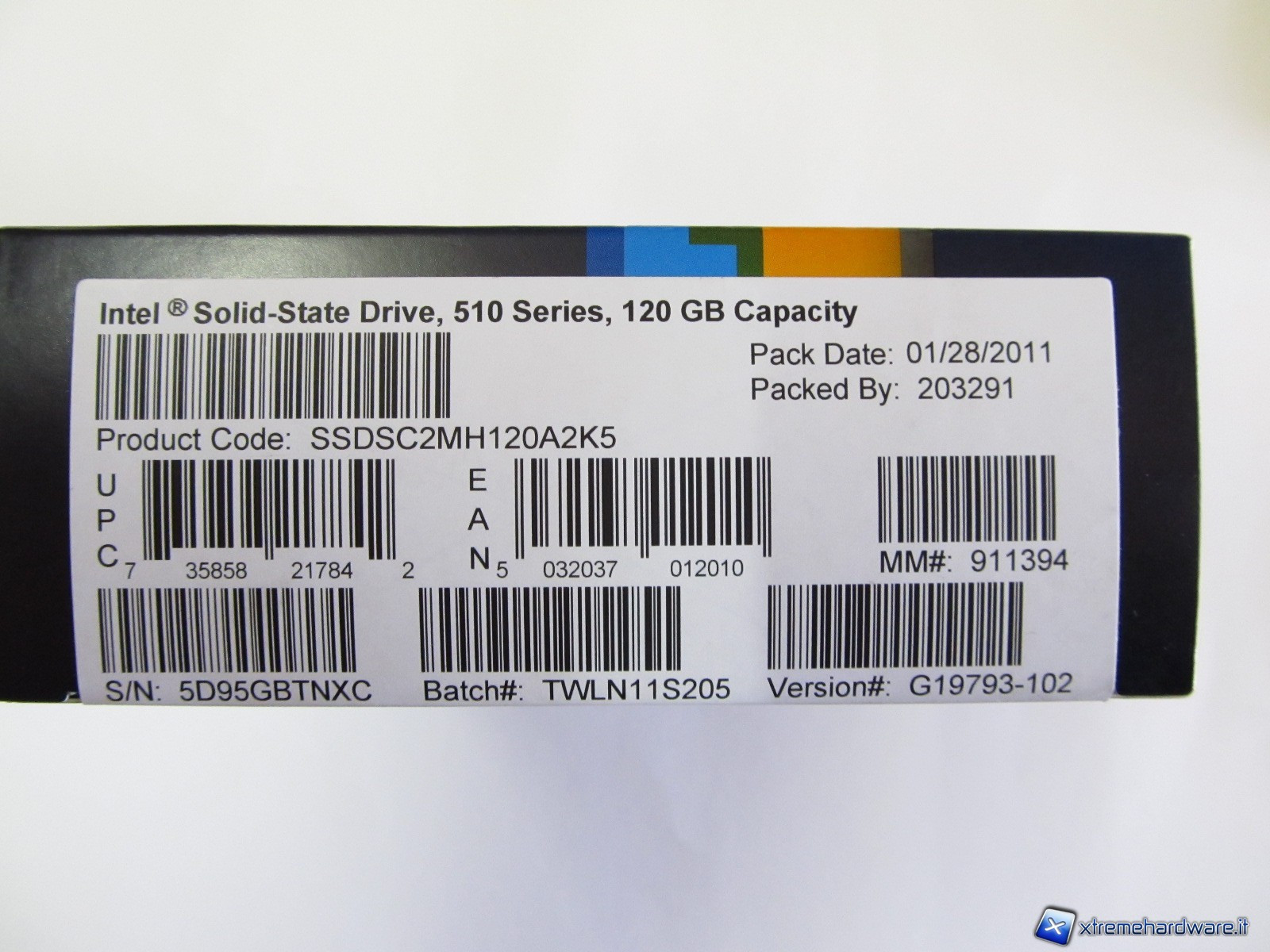 Nella parte superiore dell’Intel 510 possiamo ricavare tutte le informazioni necessarie, quali il taglio, il nome del prodotto, i vari seriali, il firmware installato (PPG2) e i vari loghi; il retro risulta essere esente da qualsiasi adesivo. Infine possiamo osservare il lato relativo alle connessioni all’interfaccia SATA con la relativa alimentazione.
