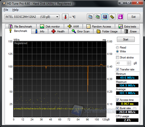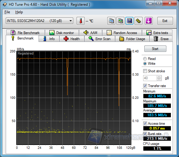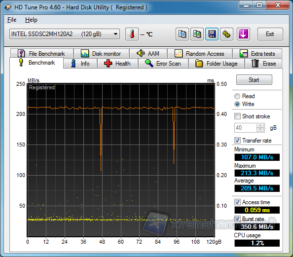 Come possiamo osservare nei grafici sottostanti relativi al Burst Rate (velocità massima relativa al trasferimento dati dall’interfaccia SATA al Sistema Operativo) che inseriamo a titolo indicativo, e al Transfer Rate Average (velocità media di trasferimento dati) risultano evidenti le scarse prestazioni del controller Marvell 9120, il quale, per quanto concerne la scrittura, risulta essere nettamente inferiore anche al controller Intel 3Gb/s e quindi ben al di sotto dai valori dichiarati da Intel; Per quanto concerne il test relativo alla scrittura notiamo valori molto al di sotto di quanto dichiarato da Intel.