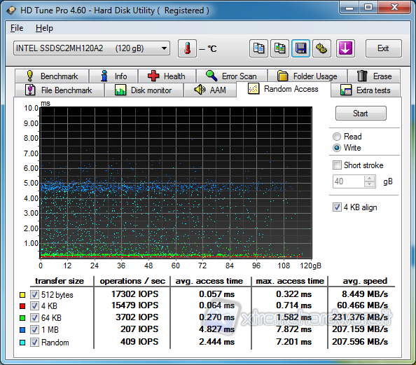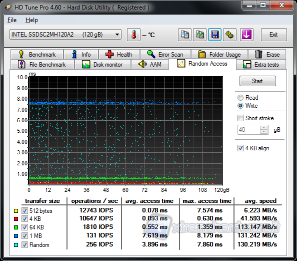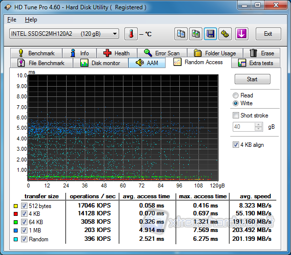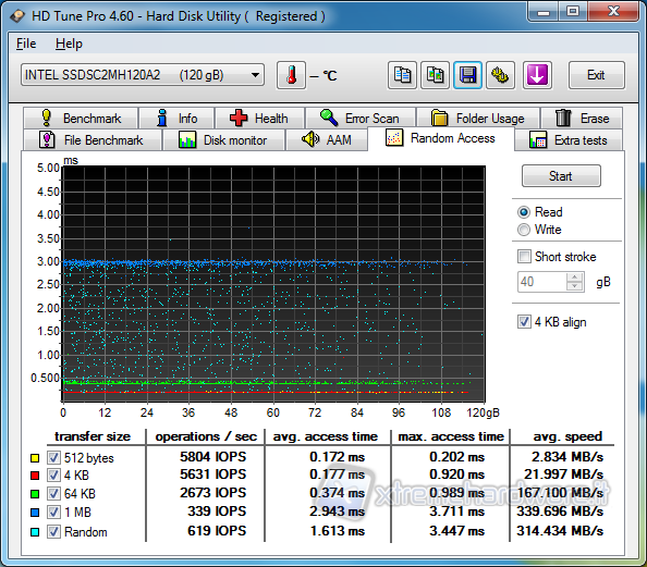 Test effettuati con Drive vuoto appena connesso all’interfacce Serial ATA 3Gb/s e 6Gb/s, senza aver effettuato alcuna partizione specifica al Disco di test, i test sono effettuati in modalità RANDOM (casuale).