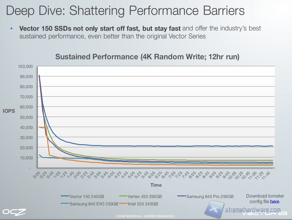 Ed un’altra dove mostra come dopo un Endurance Mode di 12 ore il Vector 150 mantenga ancora le stesse prestazioni espresse in IOPS. Notare come i concorrenti abbiamo una curva discendente maggiore del Vector 150 segno che le prestazioni dall’ Out of Box ad un periodo successivo si riducano.