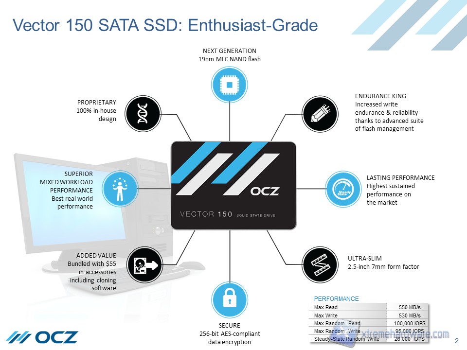 L’OCZ Vector 150 è come per molti altri SSD top di gamma OCZ, disponibile in tre diversi tagli, ovvero i più comunemente utilizzati; si parte infatti dai 120GB, passando per i 240GB, come per il drive utilizzato in questa recensione, e, per gli utenti più esigenti, è disponibile il taglio da 480GB, ottimo per installare il sistema operativo, videogames e programmi. Contrariamente a quanto si possa pensare tutti e tre i formati sono contraddistinti da un ottimo rapporto prezzo\capacità. Inoltre come possiamo notare le capacità dei tagli disponibili è stata ridotta per aumentare lo spazio utile all’overprovisioning. Per maggiori informazioni riguardanti la serie OCZ Vector 150 vi invitiamo a visitare il sito ufficiale al seguente indirizzo.