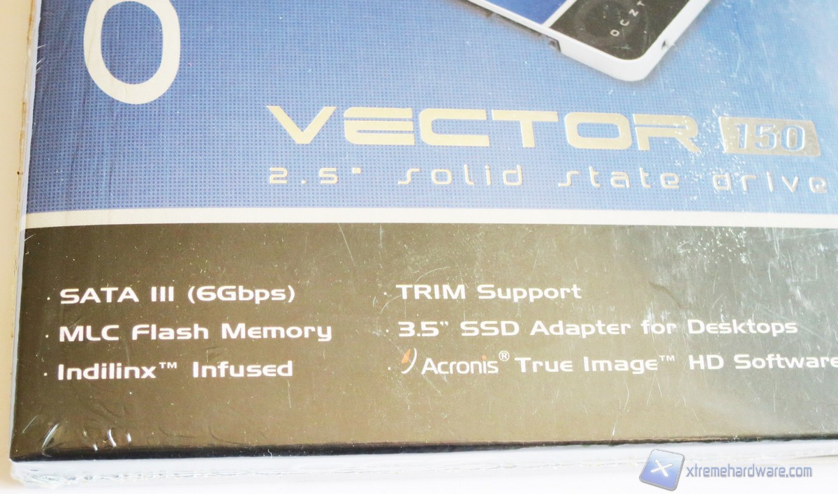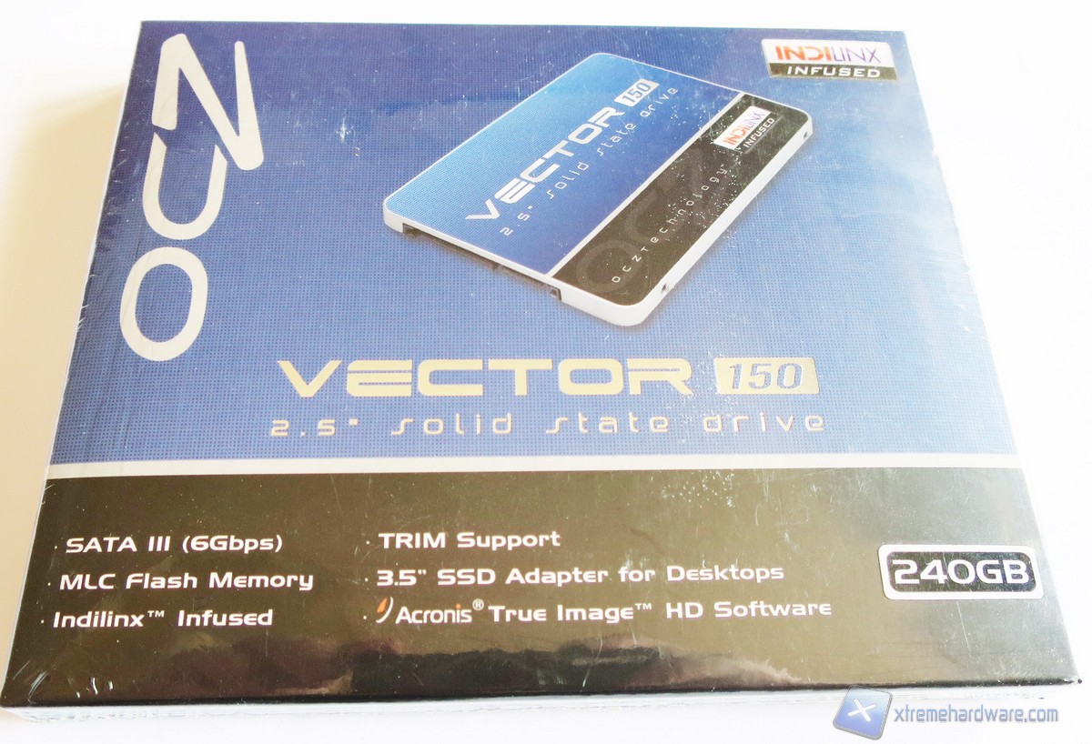 La confezione del Vector 150 è la classica che OCZ ha sempre usato per i suoi SSD. La colorazione è blu e nera così come quella del drive. Nella parte frontale troviamo un’immagine illustrativa del prodotto, il logo, il modello ed altre informazioni utili come incluso in bundle una chiave per l’attivazione del prodotto Acronis True Image HD oltre che un classico adattatore serigrafato OCZ.